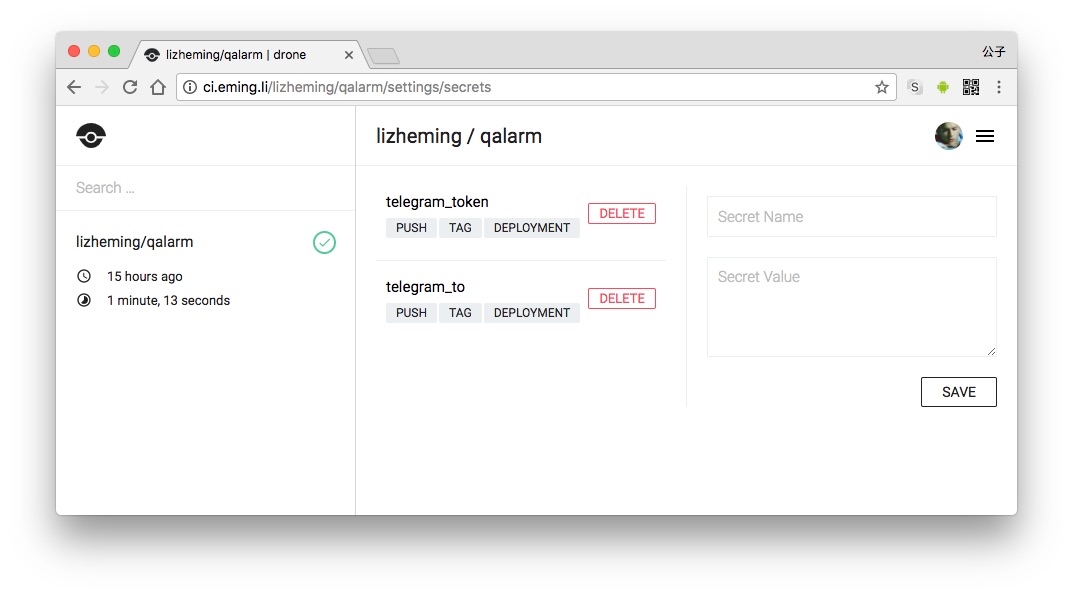 由于我们将 token 直接写在了 .drone.yml 的配置文件中,项目其它人也都可见,这会带来一些潜在的安全问题。为此我们可以使用 drone 的 secrets 功能。我们小改一下配置文件: