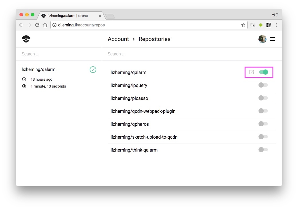 在上文《DRONE安装指南》中介绍了如何安装 Drone 服务,下面我将来介绍重头戏——如何在项目中使用 Drone 完成自动化构建任务。首先我们要在 drone 中开启自动构建,实际上它会在对象的 Git 仓库中添加 webhooks 方便当开发者执行对应 git 操作后触发自动构建任务。