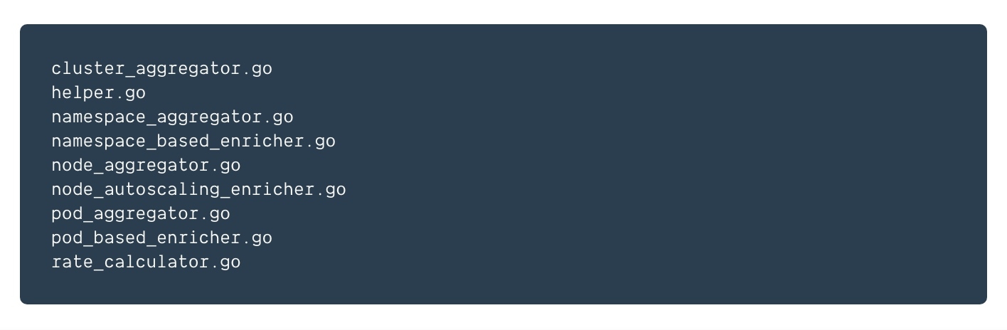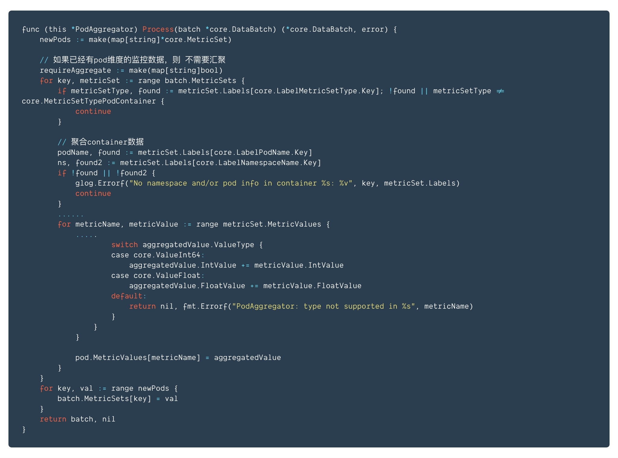cAdvisor返回的原始数据包含了nodes和containers的相关数据,heapster需要创建各种processor,用于处理成不同类型的数据,比如pod, namespace, cluster,node的聚合,求和平均之类,processor有如下几种: