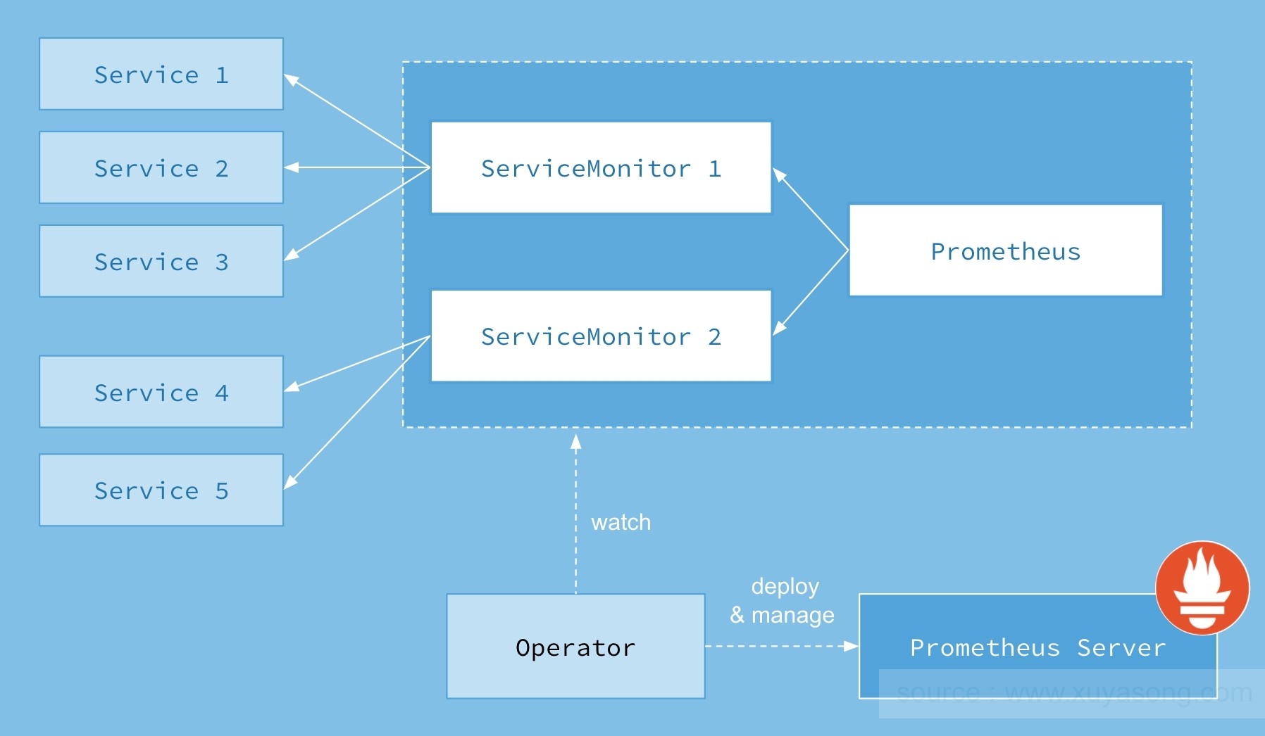 Operator的核心思想是将Prometheus的部署与它监控的对象的配置分离,做到部署与监控对象的配置分离之后,就可以轻松实现动态配置。使用Operator部署了Prometheus之后就可以不用再管Prometheus Server了,以后如果要添加监控对象或者添加告警规则,只需要编写对应的ServiceMonitor和Prometheus资源就可以,不用再重启Prometheus服务,Operator会动态的观察配置的改动,并将其生成为对应的prometheus配置文件其中Operator可以部署、管理Prometheus Service