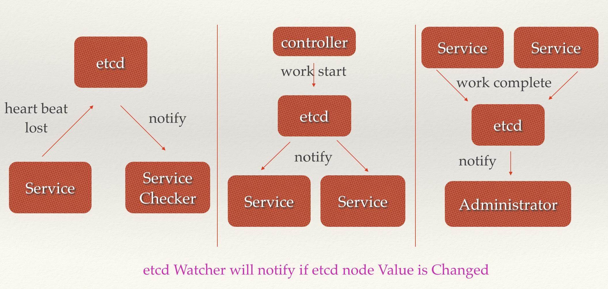 通过 etcd 完成系统调度。某系统有控制台和推送系统两部分组成,控制台的职责是控制推送系统进行相应的推送工作。管理人员在控制台作的一些操作,实际上是修改了 etcd 上某些目录节点的状态,而 etcd 就把这些变化通知给注册了 Watcher 的推送系统客户端,推送系统再作出相应的推送任务。