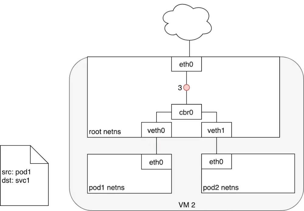 数据包从pod1所在eth0离开,通过veth对的另一端veth0传给网桥cbr0,网桥找不到service的ip对应的mac,交给了默认路由,到达了root命名空间的eth0